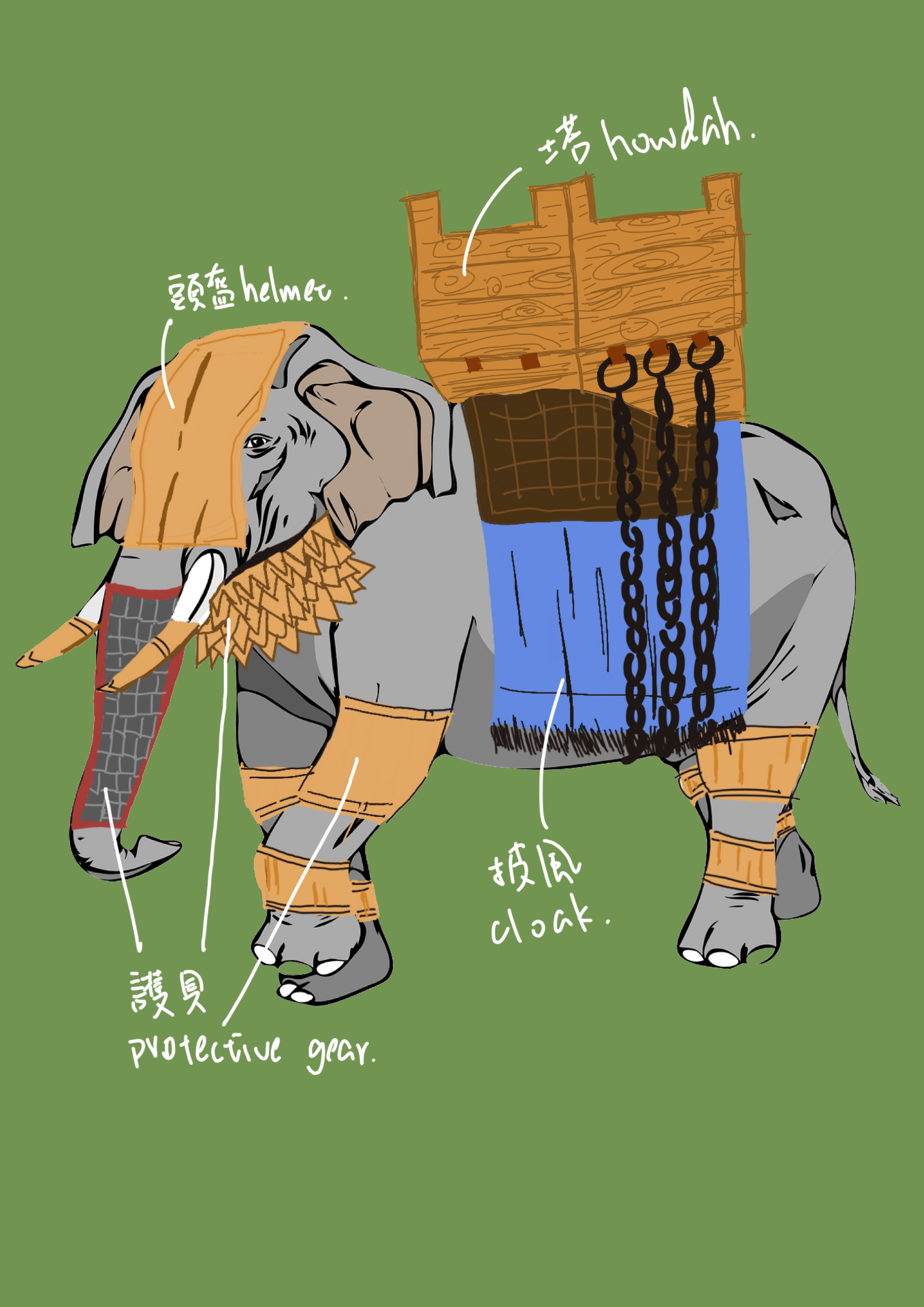 (如右圖所示) : 1. 披風(Cloak): 在大象背上鋪上像斗篷一樣的披風和護甲,用來抵禦導彈,並使大象看起來更嚇人。有時披風的材質也會更換成真正的裝甲。
